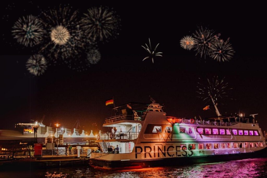 Ein besonders beeindruckendes Erlebnis ist das Feuerwerk während einer Hafenrundfahrt oder eines Segeltörns auf der Elbe. Vom Wasser aus genießen Besucher eine freie Sicht auf die Lichtershow, während rundherum zahlreiche Schiffe im Hafen liegen.