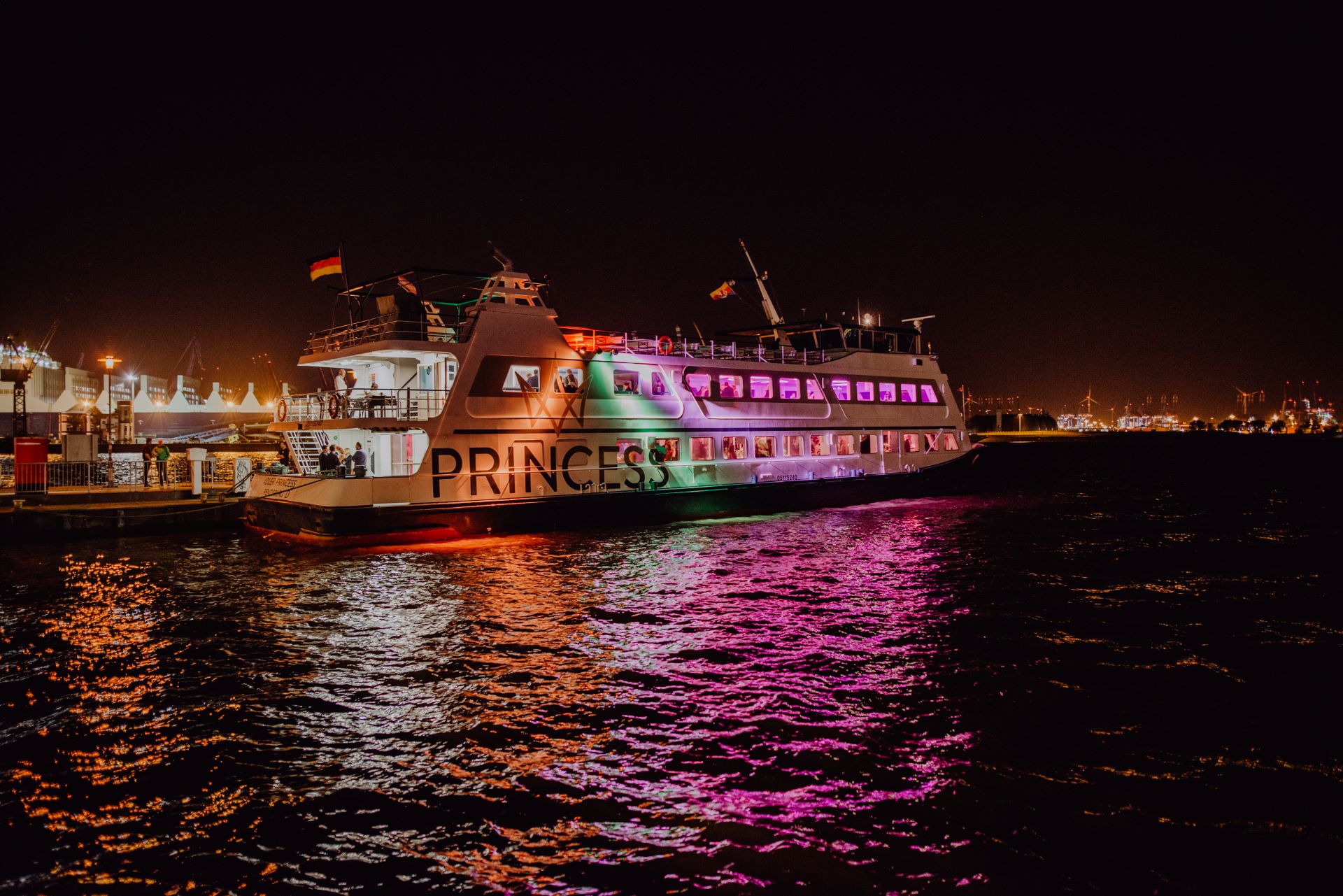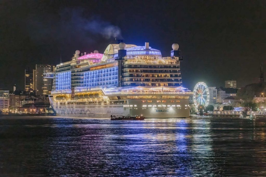 Erleben Sie den Hamburger Hafengeburtstag hautnah mit unserem modernen Salonschiff MS Princess und genießen Sie einen wundervollen Ausblick auf die Magische Lichtillumination by AIDA über der Elbe.