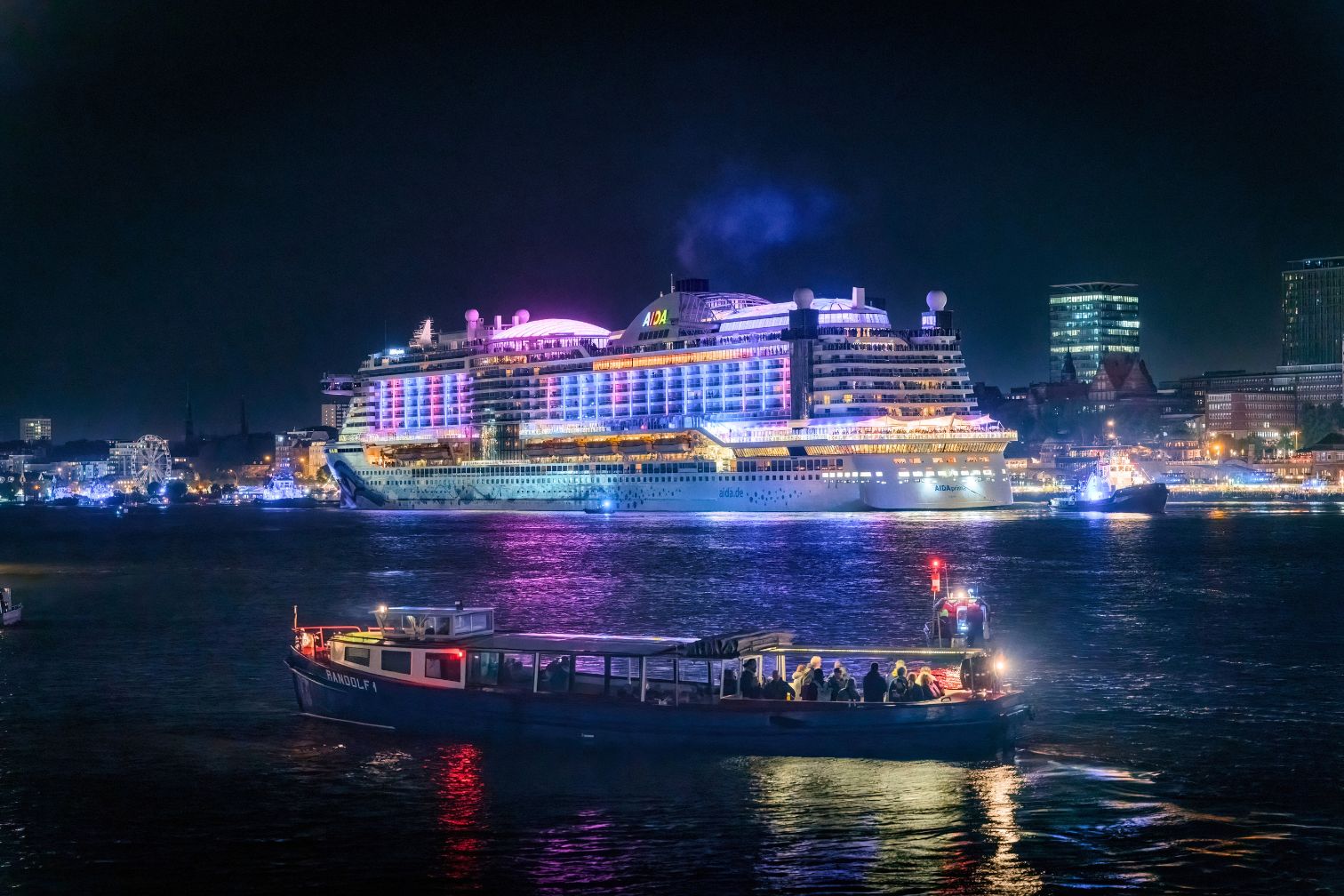 Erleben Sie den Hamburger Hafengeburtstag hautnah mit unserem Salonschiff MS Solar und genießen Sie einen wundervollen Ausblick auf die Magische Lichtillumination by AIDA über der Elbe.