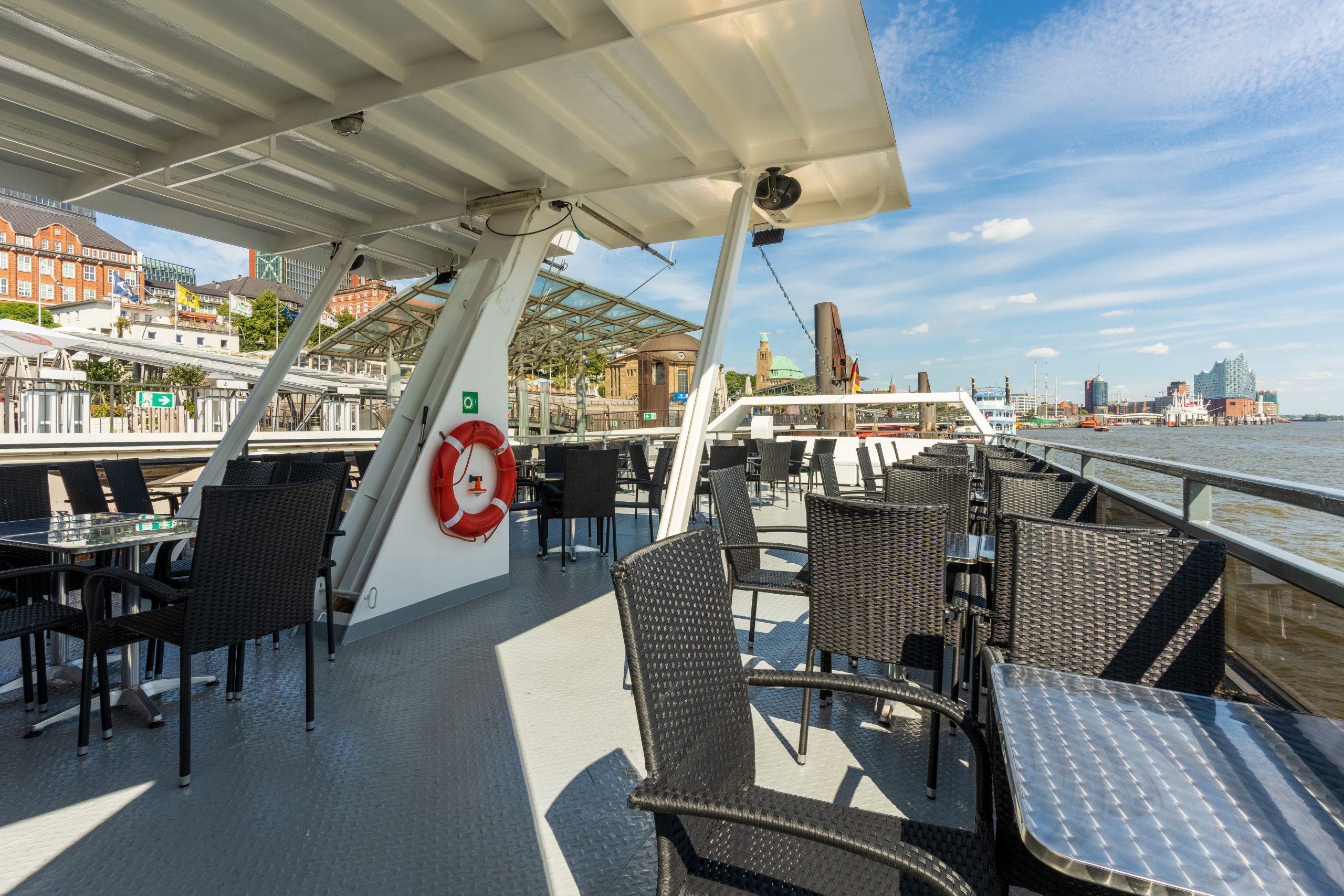Das offene Freideck bietet viel Raum und beeindruckende 360°-Blicke auf den Hamburger Hafen. Dadurch eignet sich die MS Solar besonders gut für Hafenrundfahrten, bei denen ein weiter Blick auf Terminals, Docks und maritime Highlights im Mittelpunkt steht.